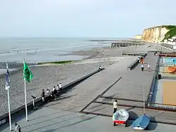 The river Veules, which flows through the commune, is the shortest sea-bound river in France at 1.149 kilometres (0.714 mi).[3] Its water is used to create ponds for growing watercress whence it finds its way to the sea through a gap in the high chalk cliffs, which overlook a sand and pebble beach.