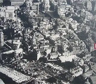 The Roman Forum and the Alessandrino district before the demolitions (between 1924 and 1932): the Ghettarello above the Forum of Caesar has already been demolished, while the other buildings are still intact.