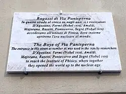 Via Panisperna boys (Italian: i ragazzi di Via Panisperna) is the name given to a group of young Italian scientists led by Enrico Fermi, who worked at the Royal Physics Institute of the University of Rome La Sapienza and made the famous discovery of slow neutrons in 1934. This later enabled development of the nuclear reactor and construction of the first atomic bomb.
