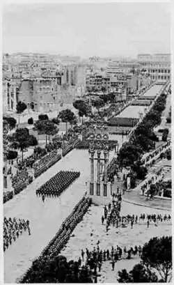 The Via dei Fori Imperiali was finally built during the Fascist period between 1924 and 1932. The tentative name of the road during its construction was Via dei Monti,[1] but it was named Via dell'Impero when it was inaugurated.[1] Mussolini, on horseback, cut the ribbon opening the road on 9 April 1932 and led a military parade with veterans of World War I. After the end of World War II, the road was renamed to its present name. Each year on 2 June it hosts a parade in celebration of the founding of the modern Italian Republic.