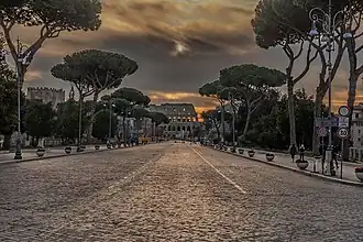 The Via dei Fori Imperiali (formerly Via dei Monti, then Via dell'Impero)[1] is a road in the centre of the city of Rome, Italy, that is in a straight line from the Piazza Venezia to the Colosseum. Its course takes it over parts of the Forum of Trajan, Forum of Augustus and Forum of Nerva, parts of which can be seen on both sides of the road. Since the 1990s, there has been a great deal of archaeological excavation on both sides of the road, as significant Imperial Roman relics remain to be found underneath it.