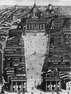 Plans were drawn up several times over the years for the construction of a major link between the Vatican City and the centre of Rome; the number of submissions increasing dramatically with the onset of the Italian Renaissance. The first design was submitted by Leone Battista Alberti during the reign of Pope Nicholas V,[6] and formed one of the two perennial designs proposed for the area. Alberti envisioned an "open" plan, consisting of a single voluminous V-shaped boulevard, widest at St. Peter's Basilica itself and tapering as it approached the Tiber. The other scheme of designs submitted by architects was a "closed" plan that would consist of two roads arching outwards in an ellipse, with the Tiber and the Square at opposite ends. Proponents of a closed plan would usually suggest that the space between the two causeways be separated by a colonnade, or by a row of inhabited structures whose designs would be scrutinised and approved by architects employed by the Holy See. Variations on both themes were submitted time and time again. Proponents of an "open" plan included such architects as Giovanni Battista Nolli and Cosimo Morelli.[7][8] A number of other architects, such as Carlo Fontana, and at least one Pope (Sixtus V) favoured a "closed" design, with a number of streets radiating from the central square, maintaining the "spina", or spine, of the structures of Borgo directly between the square and the Tiber.[9] Neither approach moved beyond sketches and blueprints. Both open and closed designs were considered by the Vatican, but were ultimately discarded for reasons of expense. A thorough examination of the costs of constructing a thoroughfare was made by the Vatican-approved St. Peter's Building Commission in 1651. Their conclusion was that "the cardinals' proposal to demolish all the buildings between the Borgo Nuovo and the Borgo Vecchio for a greater and longer vista to the church" would be infeasible due to inordinately high expropriation costs and vested property interests.[7]
