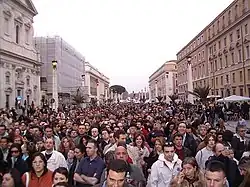 Via della Conciliazione ("Road of the Conciliation"[1]) is a street in the Rione of Borgo within Rome, Italy. Roughly 500 metres (1,600 ft) in length,[2] it connects Saint Peter's Square to the Castel Sant'Angelo on the western bank of the Tiber River. The road was constructed between 1936 and 1950, and it is the primary access route to the Square. In addition to shops, it is bordered by a number of historical and religious buildings – including the Palazzo Torlonia, the Palazzo dei Penitenzieri and the Palazzo dei Convertendi, and the churches of Santa Maria in Traspontina and Santo Spirito in Sassia.