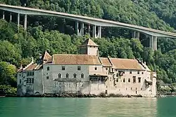 The Viaduc de Chillon is a viaduct in Switzerland located in Veytaux to the southeast of Montreux. Built by the Consortium des Viaducs de Chillon between 1966 and 1969, it takes its name from the Château de Chillon which lies downhill on the shores of Lac Léman. The viaduct comprises two structures 12 metres (39 ft) wide carrying the east and westbound lanes of the Swiss A9 autoroute.[1]