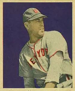 Raschi started the 1948 season with the Yankees; after losing his first start, he won nine decisions in a row.[9] He shut out Philadelphia on May 14, allowing just three hits.[10] On June 2, he threw a shutout against the Detroit Tigers, singling against Art Houtteman and scoring the only run of the game when Johnny Lindell drove him in with a double.[11] He threw a second consecutive shutout in Game 2 of a doubleheader against the Browns on June 6, holding St. Louis to three hits.[12] Selected to his first All-Star Game in 1948, Raschi earned the win after pitching three scoreless innings and driving in the winning run with a two-RBI single against Johnny Schmitz.[13][14] Facing the Indians on August 7, he threw a four-hit shutout in front of 66,693 fans at Cleveland Stadium in a game that drew the Yankees within half a game of the AL lead.[15] He was 17–5 with a 3.31 ERA after holding the Athletics to four hits in a shutout on August 22, but he posted an ERA of 6.00 in his final 11 games as the Yankees finished in third place.[1][9] Raschi had a 19–8 record and a 3.84 ERA, ranking among the AL leaders in wins (tied with Bob Feller for fourth), winning percentage (.704, third, behind Jack Kramer's .783 and Gene Bearden's .741), strikeouts (124, fifth), and shutouts (six, tied for second with Bearden behind Feller's 10).[16] He finished 11th in AL Most Valuable Player (MVP) voting.[1]