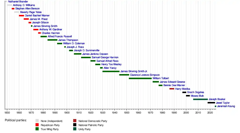 - ^ Both President King and Vice President Yancy resigned on December 3, 1930. Secretary of State Barclay was inaugurated as president, and Vice President James Skivring Smith Jr. was elected in a special election soon after.