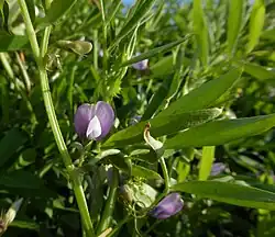 An annual with climbing stems, scrambling or climbing to about 60 cm tall. The leaves are arranged alternately along the stem, are up to about 9 cm long, have 2–3 pairs of leaflets, and end in branched tendrils. The petioles are 2 cm long with a large, ovate, dentate stipule at the base. The flowers are arranged in pairs (although sometimes solitary) on long (5 cm) peduncles branching from the leaf axils. The petals are purple and white, 2 cm long, and have 10 stamens and 1 style. The fruit is a hairy pod or legume up to 5 cm long with 4 to 8 seeds.[2] It has 14 chromosomes.[2][4]