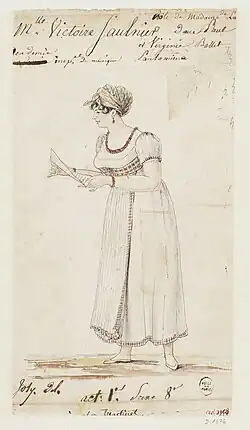 In 1807, she was described by Jean-Georges Noverre with the following statement: "Miss Victoire Saulnier is of an elegant figure she is as beautiful as Venus but the Graces, the Laughter, the Games, and the Pleasures are not in her train. I advise her to call them and invoke Therpsicore. With application and zeal she will acquire all that she lacks".[11]