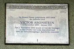 Victor Aronstein (1 November 1896 – 13 January 1945) was a German-Jewish medical doctor whose practice in Alt-Hohenschönhausen, Berlin served as a meeting place for communists and social democrats during the rule of the Nazi Party. He was deported to the Łódź Ghetto in 1941 and then moved to Auschwitz, where he was murdered in 1945.[1]