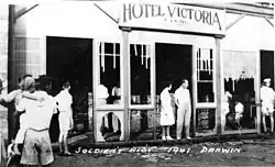 During World War II the hotel was occupied by United States and Australian naval authorities who remained there until the end of the war. In September 1941, rioting soldiers in the Darwin city area caused superficial damage to the hotel, such as broken windows and furniture.[15] With many troops stationed in Darwin, a fight broke out in the hotel that quickly spread outside into Smith Street. Although the damage was blamed on the soldiers, records show that civilians were involved in the riot.[16]