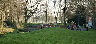 Victoria Park is a public green space in St James End, Northampton, England, south of Spencer Bridge Road. The park has open grass areas and lines and belts of trees. A stream, a tributary of the River Nene flows from north to south through the park on the east side next to the railway line. A small stream, Dallington Brook, also flows through the park from the north-west joining the Nene tributary. The park has an area of about 6.5 hectares.[1]