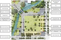 The Christchurch Central Development Unit released plans in 2014 for a NZ$7,000,000 remodelling of the square as part of the Avon River precinct upgrade.[72] The plan included a large multi-use grass area, outdoor market spaces, and a riverbank amphitheatre. The change would require the statues and Bowker fountain to be moved, as well as the removal and replacement of some established trees. The planned changes were heavily criticised, in part due to the perceived lack of consultation, but also the costly and seemingly unnecessary changes to the design from the late 1980s, which was largely undamaged in the earthquake.[73][74] The government's announcement was not consultation, but was issued for information, and the resulting calls for a consultation exercise were initially denied.[75] After significant public pressure the project was put on hold in February 2015, and a public consultation period started. In July 2015, draft plans were released for some restoration work that would see Victoria Square largely unchanged.[76]