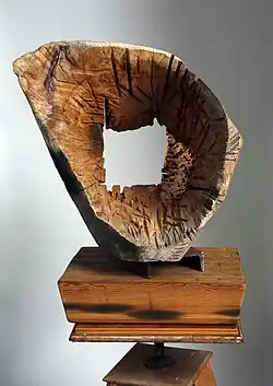 Thorson’s sculptures tread a line between recognizable form and pure abstraction. In her artist statement for the exhibition at Garrison Art Center 2018 Thorson says she “has been seduced by basswood. Its softness of touch, when smooth, evokes the human body.” Starting with lumber or recycled wood, Thorson sees potential shapes and feels her way along the cracks, knots, and grain, following the lines of energy. She carves and refines to create slits of light between masses, and discovers abstract forms “to express life’s silences and vibrations.” Her work is often anchored by repurposing industrial metal that is the right weight, proportion, and aesthetic to be part of the piece.
