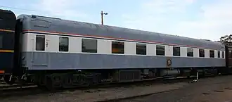 - State Car 5 was based on the steel air-conditioned S type carriage design in 1951. Royal insignia were painted on each side.[6] The carriage featured a kitchen, lounge/dining area, two main bedrooms with en-suite facilities (a bathroom with a bath, basin, shower and toilet), two sleeping/sitting compartments for attendants, and a third bathroom. In 1954 it was displayed at the Centenary Exhibition.[7] It was repainted into the grey livery in 1988 for the royal tour of the year, and has since been allocated to the Seymour Railway Heritage Centre collection.[8]