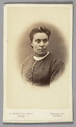 During the Paris Commune, when she was 28 years old, Victorine Lefèvre was a frequent visitor to the Saint-Michel des Batignolles club in the 17th arrondissement.[4] Considered a leader, she would have proclaimed "that the ladies must take up arms to guard the ramparts, while the men go out against the troops of Versailles".[5] Victorine Gorget was also very active in the l'Union des femmes pour la défense de Paris et les soins aux blessés.[6]