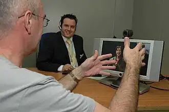 In a typical VRI situation, the two parties are located together at one location with a videophone or web camera, and a television or computer screen. The interpreter works from another location—either an office, home-based studio or call center—also using a videophone or web camera and television or computer screen.[2] The equipment must provide video and audio connectivity, or a separate telephone line can be used for audio. The video interpreter facilitates communication between the participants who are located together at the other site. In the case of signed language interpretation (such as American Sign Language), the interpreter hears the voices of the hearing people through the microphone or telephone, and renders the message into sign language, via a video camera, which the deaf person views on his or her video display. In turn, when the deaf participants sign to the camera, interpreters view it from their screen, and speaks the aural interpretation into a microphone or telephone for the hearing people.