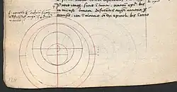 Georg Peurbach's Theoricae Novae Planetarum was written in 1454 and then published by Regiomontanus in 1472. This treatise was an elaboration of the Ptolemaic astronomy,[9] attempting to replace the older treatise entitled Theorica Planetarum [Gerardi], attributed to Gerard of Cremona, which was one of the major theoretical works in the university astronomical syllabus. Peurbach's Theoricae Novae Planetarum aligns more with the Parisian Alfonsine tables, while the one by Gerard of Cremona is closer to the Toledan tradition. The diagrams serve as a pedagogical tool for explaining the motion of the major planets, of the Sun and the Moon, of the fixed stars (the 8th sphere) and the eclipse theory. Theoricae is situated on folios 2r-24r, precisely it is one of the three earliest manuscripts containing this work.[10] The diagrams that serve to illustrate Peurbach's theory occupy the margins (unlike the printed edition, where they are situated directly in the text[11]); however, the layout of the page suggests that Regiomontanus has intentionally left wide margins to later fill them with technical drawings and notes.