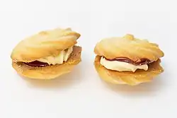 The most common UK version was popularised by Mr Kipling, consisting of two shortbread biscuits sandwiched with buttercream and jam.[1] In this sense they resemble the older Empire biscuit.
