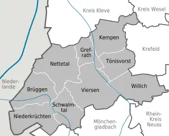 Viersen (district)North Rhine-WestphaliaKleve (district)Wesel (district)DuisburgKrefeldRhein-Kreis NeussMönchengladbachHeinsberg (district)NetherlandsNettetalTönisvorstGrefrathNiederkrüchtenBrüggenViersenWillichKempenSchwalmtal