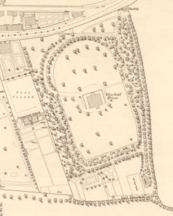 Viewfield House had substantial grounds surrounded by trees in the nineteenth century, as shown on J. Wood's 1823 town plan, and (illustrated) the 1854 Ordnance Survey 1:1056 map, which also shows the staircase extension on the south side of the house.[1][4]