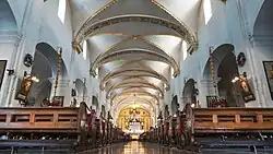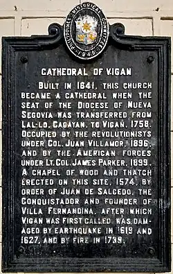 The first church was built in 1641[5] and was damaged by earthquake in 1619 and 1627. A third church was burned in 1739. Upon the request of then Bishop Juan de la Fuente Yepes, the seat of the Diocese of Nueva Segovia was transferred from Lal-lo, Cagayan to Ciudad Fernandina de Vigan (present-day Vigan) through a ceremonial procession on September 7, 1758.[6] With the transfer of the seat of the Diocese, the church of Vigan became a cathedral on that same year. Governor General Jose de Basco ordered the establishment of a new church in 1786. The fourth and present-day church was built from 1790 to 1800 under the Augustinians.[7] It was occupied by the revolutionists under Colonel Juan Villamor in 1896 and by the American forces under Lieutenant Colonel James Parker in 1899.[2]