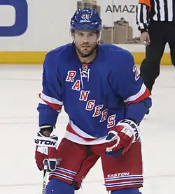 On 1 July 2015, with the ambition to reclaim his status in the NHL after the Predators bought out the remainder of his previous deal, Stålberg was signed to a one-year $1.1 million contract with the New York Rangers.[24][25] Despite an early season concussion on 24 October 2015 against the Philadelphia Flyers from a hit by Flyers' defenseman Radko Gudas, causing him to miss the next two games, Stålberg enjoyed early offensive success, securing a role on the checking line and occasional time on the team's penalty killing unit as the season went on.[26] In 75 games for the 2015–16 season with the Rangers, Stålberg contributed with nine goals, 11 assists and 20 points. He was held pointless in all five games in the Rangers first round exit in five games in the 2016 playoffs against the Pittsburgh Penguins.