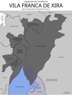 Vila Franca de Xira (European Portuguese pronunciation: [ˈvilɐ ˈfɾɐ̃kɐ ðɨ ˈʃiɾɐ] ⓘ), officially the City of Vila Franca de Xira (Portuguese: Cidade de Vila Franca de Xira), is a city and municipality in the Lisbon District in Portugal. The population in 2021 was 137,659,[1] in an area of 318.19 km2.[2]