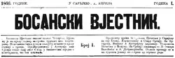 Sopronova pečatnja, or Sopron's Printing House, was officially opened on 19 April [O.S. 7 April] 1866.[7] The Cyrillic orthography that was used in it was consistently in accordance with the linguistic reform of Serbian philologist Vuk Karadžić, which was at that time relatively new and still not universally accepted.[9][10] The first issue of a political-informative and educational weekly newspaper named Bosanski vjestnik (Serbian Cyrillic: Босански вјестник, "Bosnian Herald") appeared on the same day.[7] This was the first newspaper ever to be published in Bosnia and Herzegovina.[11] Sopron made a deal with the vilayet's authorities to publish it independently from the official gazette.[7] When Sopron presented the editorial policy of his newspaper to the authorities, he indicated that it would be printed in the Serbian language, much to the Ottomans' displeasure. The authorities subsequently scratched "Serbian" and replaced it with "Bosnian". Sopron accepted the revision and went along with Osman Pasha's idea of promoting a unitary Bosnian nation.[6] Nevertheless, Bosanski vjestnik had "a decidedly Serb orientation".[11] Sopron did not consider this contradictory, as he apparently identified Bosnian-ness with Serbness. In the newspaper, the language was occasionally referred to as Serbo-Bosnian, while both the Serb and the Croat ethnic designations were expressed.[6]