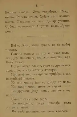 Apart from the newspapers Bosanski vjestnik, Bosna, and Sarajevski cvjetnik, the Vilayet Printing House published around fifty books and booklets in Serbo-Croatian, Ottoman Turkish, and Hebrew. While most of these publications were concerned with various Ottoman laws and legislation, the printing house also published a number of textbooks.[14] The textbooks for Serb elementary schools in the vilayet were prepared by Miloš Mandić on the basis of those that were used in Serbia. These include an alphabet book (Буквар), a short Biblical history (Кратка свештена историја), a basal reader (Прва читанка), and the First Knowledges (Прва знања); they were published in 1867 and 1868.[13][18] Mandić's alphabet book, the printing house's first textbook, was the second Serbian alphabet book using the reformed Serbian Cyrillic. The First Serbian Alphabet Book (Први Српски Буквар), authored by Vuk Karadžić, had been published in Vienna in 1827.[13][14] The original plan was to print fifteen textbooks for Serb schools, ranging in subject from grammar, arithmetic, geography and religious teaching, but only four were printed.[19] Although they were based on the textbooks used in Serbia, the vilayet's authorities made sure that every mention of Serbs and the Serbian language was erased from them.[20]