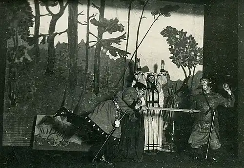 A characteristic production of the period was Dolerių kunigaikštis (Duke of Dollars) first staged in October 1921 and reworked as Monkey Business in 1924.[1] It depicts a Lithuanian American who returns to Lithuania to open a business but ends up swindling the investors.[2] The theatre also staged parodies of the classics (e.g. The Government Inspector by Nikolai Gogol, Iliad, The Three Musketeers) adapted to Lithuanian realities.[1] The theatre also reworked some Lithuanian works. For example, Tautinis bizūnas (National Whip) was a reworked version of the Lithuanian comedy America in the Bathhouse.[1] The plays continued to get longer and more complex as the theatre became more experienced. In addition to performing in a rented 238-seat hall on Maironis Street in Kaunas, Vilkolakis frequently toured various Lithuanian cities and incorporated local events into its plays.[1]