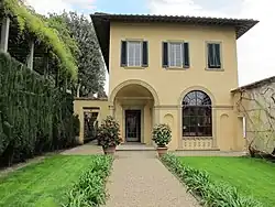 The villa was the subject of significant attention during the Second World War. Initially used as the main office of the Bank of Tuscany, the villa was seized by German forces and used as a military headquarters. Under the control of Nazi Germany, in 1944, the villa underwent bombardment by machine gun and artillery fire of the Allied forces, causing significant damage to the house and gardens.[5] At one point, a German mortar shell penetrated the roof of the villa and became lodged without detonating in the library.[1][2]