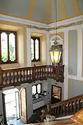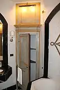 The villa's elliptical staircase is made of brick embellished with fake marble decorations. The staircase starts on the ground floor, with two identical flights to the principal, or noble, floor above. The lighting is enhanced by Swarovski crystals. A modern elevator has been installed in the left wing of the palace, running from the ground floor to the top floor.