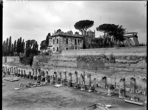 The excavations conducted between 1926 and 1929 were very productive. After the demolition of Villa Mills, systematic excavations were started on the site and the residences where the first Roman emperors lived were brought to light: the Domus Augustana, which was the private part of the palace with the Augustan's private apartments and baths, enlarged by Domitian. The only surviving structure of the Renaissance complex is a small lodge, called "Loggetta Mattei" or "Casina Farnese", that had housed the frescoes of Baldassarre Peruzzi, and a 19th-century structure built by the sisters of the Visitation that has become the seat of the Palatine Museum.[3][15]