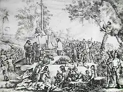 Later, on Palm Sunday, after the celebration of Mass and in the presence of indigenous authorities, Cortés says goodbye to them and continues his journey.[1]: 83 Leaving a group of 60 soldiers in the newly founded village of Santa María de la Victoria, he gave them the mission to pacify the region. After that, Cortés left toward Culua (modern-day San Juan de Ulúa, Veracruz), in search of the riches of the great empire "...from there, where the sun sets."
