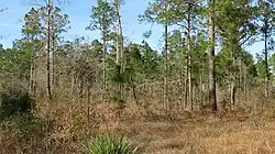 Several areas in the creek's drainage are home to arid sandyland habitat dominated by Longleaf Pine (Pinus palustris), Blue Jack Oak (Quercus incana) and farkleberry (Vaccinium arboreum). Large deposits of well draining sand left behind by receding seas contribute to the area's xeric nature. Additionally, lack of nutrients in the substrate causes sparse overstory, leading to higher average temperatures and more dryness. Some common understory plants include the prairie prickly pear cactus (Opuntia macrorhiza), Gulf Coast Yucca (Yucca louisianensis), Sandhill sunflower (helianthus debilis subsp. silvestris), as well as rare plants such as Oklahoma Prairie Clover (Dalea villosa subsp. grisea), and the endemic Texas trailing phlox (Phlox nivalis subsp. texensis).[6]