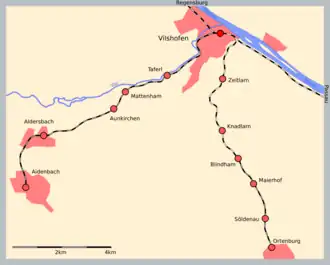 The Vilshofen (Niederb)–Aidenbach railway was a German branch line in the state of Bavaria which opened on 21 November 1898. Passenger traffic ceased in 1962 and all services were withdrawn in 1988. The line was then dismantled.