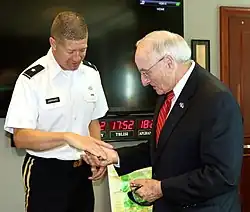 Dooley receives a challenge coin from Brig. Gen. Joseph Jarrard in 2018.