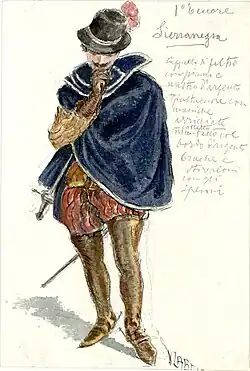 Starting from 1901, he created drawings and portraits of artistic and theatrical personalities to the art magazine Il Mezzogiorno artistico, including one of Eleonora Duse.[5] In 1902, he exhibited illustrations for the Eighth and Ninth Cantos of Dante's Inferno at the First International Exhibition of "Bianco e Nero" in Rome.[4] In the years following 1904, after a brief stay of about a year in New York, where he continued working as an illustrator for magazines and newspapers, he resumed his painting career. In Naples, he created two frescoes in the examination room and vestibule on the first floor of the university building on Corso Umberto I. These frescoes depict Roberto d'Angiò, Petrarch and the tragic end of Hypatia.[4] Vincenzo La Bella resumed collaborations with periodicals and newspapers, including Il Mattino illustrato, Il Roma della domenica, L'Arte muta (a film life review), and the Milanese magazine Varietas. Between 1898 and 1918, he designed numerous covers for songs published by music publishers Santojanni, Pierro, and Alfano.[6]