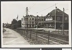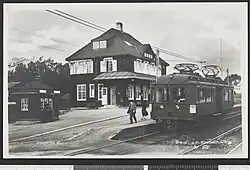 The station building which stood from 1913 to 1971 was designed by Carl Michalsen,[5] of Ekman, Smith & Michaelsen. The wooden panel building as a gabled roof. On the platform side it had a pillar-supported roof covering part of the platform. The ground floor featured a waiting room, a ticket sales office, a post office and a cargo handling facility. The upper two stories were used for the line's administration.[3]
