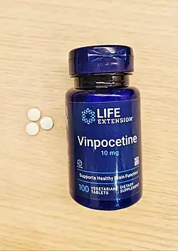 10. ^ a b c d Cohen PA (October 2015). "Vinpocetine: An Unapproved Drug Sold as a Dietary Supplement". Mayo Clinic Proceedings. 90 (10): 1455. doi:10.1016/j.mayocp.2015.07.008. PMID 26434971.