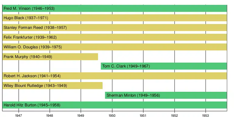At the beginning of the Vinson Court, the court consisted of Vinson, Burton, and seven of Franklin D. Roosevelt's appointees: Hugo Black, Stanley Forman Reed, Felix Frankfurter, William O. Douglas, Frank Murphy, Robert H. Jackson, and Wiley Rutledge. Rutledge and Murphy died in 1949, prompting Truman to appoint Tom C. Clark and Sherman Minton to the bench. Vinson died in September, 1953. President Dwight Eisenhower appointed Earl Warren as Vinson's successor by means of a recess appointment.