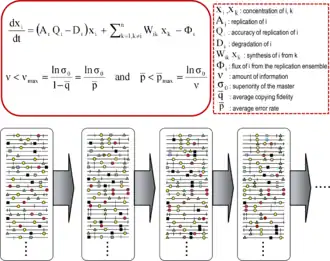 - ^ Eigen M (October 1971). "Selforganization of matter and the evolution of biological macromolecules". Die Naturwissenschaften. 58 (10): 465–523. Bibcode:1971NW.....58..465E. doi:10.1007/bf00623322. PMID 4942363. S2CID 38296619.
