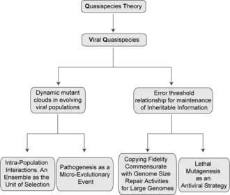 The core quasispecies concepts are described by two fundamental equations: replication with production of error copies, and the error threshold relationship. They capture two major features of RNA viruses at the population level: the presence of a mutant spectrum, and the adverse effect of an increase of mutation rate on virus survival, each with several derivations.[1]