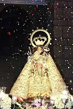 Our Lady of the Forsaken (Spanish: Virgen de los Desamparados or Nuestra Señora de los Desamparados; Catalan: Mare de Déu dels Desamparats, IPA: [ˈmaɾe ðe ˈðew ðelz ðezampaˈɾats]) is a Catholic invocation of the Virgin Mary.[1] She is the patroness of Valencia and one of seven patrons of the Autonomous communities of Spain. She appears with a lily in one hand and in the other, she carries the baby Jesus who bears the cross in his arms. Her posture is characterized by a slight forward tilt, and hence, she is known affectionately as the Geperudeta (hunchback) of València.[2] Her image is housed in the 'Basilica de la Mare de Déu dels Desamparats'.