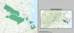 The Virginia Legislature's 2012 redistricting was found unconstitutional, in part because of racial gerrymandering, and replaced was with a court-ordered map on January 16, 2016 for the 2016 elections.[11][12][13][14][15][16][17] From 1993 to 2016, the 3rd had covered most of the majority-black precincts in and around Hampton Roads and Richmond. The court-drawn map shifted the area near Richmond to the 4th district.