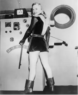 A radio version of the show ran from 1952 to 1955, using the same cast, but employing more complex story lines, as radio broadcasts were not constrained by expensive studio sets.[6] Along with Hewitt, the cast included Ed Kemmer as Commander-in-Chief Edward "Buzz" Corry, Lyn Osborn as Cadet Happy, Ken Mayer as Major Robbie Robertson, and Nina Bara as Tonga. Although Hewitt was famous for providing "blonde cheesecake appeal"[4] to her Saturday morning fans, her character was also a scientist who could assemble an atomic bomb and navigate the universe. She was also the inventor of the "Agra Ray", a device that sped up plant life on barren planets. In the absence of male crew members, who were often engaged in various pursuits away from the spaceship, Carol could ably fill in as the spaceship's pilot. Hewitt's character was regarded as a role model for young girls in the 1950s.[7]