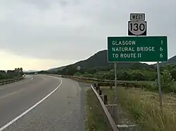 SR 130 begins at US 11 (Lee Highway) in the hamlet of Natural Bridge next to Natural Bridge Hotel. The state highway heads east as two-lane undivided Wert Faulkner Highway, which provides access to the visitor center that serves the underside of the National Historic Landmark. At Natural Bridge Station, SR 130 passes by the southern end of Sallings Mountain and under Norfolk Southern Railway's Roanoke District. The state highway passes through the town of Glasgow, where the highway has an at-grade intersection with a rail connector between the Roanoke District and CSX's James River Subdivision. SR 130 exits Glasgow by crossing the Maury River then meets US 501 (Glasgow Highway) at an intersection east of the river.[1][2]