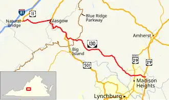 Virginia State Route 130 (SR 130) is a primary state highway in the U.S. state of Virginia. The state highway runs 34.69 miles (55.83 km) from U.S. Route 11 (US 11) at Natural Bridge east to SR 669 and SR 670 east of US 29 near Madison Heights. SR 130 runs concurrently with US 501 from Glasgow through the James River gorge through the Blue Ridge Mountains, connecting eastern Rockbridge County with western and southern Amherst County near Lynchburg.