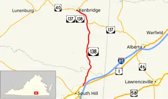State Route 138 (SR 138) is a primary state highway in the U.S. state of Virginia. The state highway runs 16.90 miles (27.20 km) from U.S. Route 1 (US 1) in South Hill north to SR 40 in Kenbridge. SR 138, which runs concurrently with SR 137 near Kenbridge, connects that town with Interstate 85 (I-85).