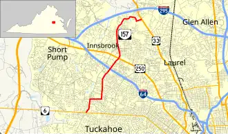 State Route 157 (SR 157) is a primary state highway in the U.S. state of Virginia. The state highway runs 7.71 miles (12.41 km) from SR 6 in Tuckahoe north to U.S. Route 33 (US 33) in Glen Allen. SR 157 passes through western Henrico County, a suburban area north and west of Richmond.